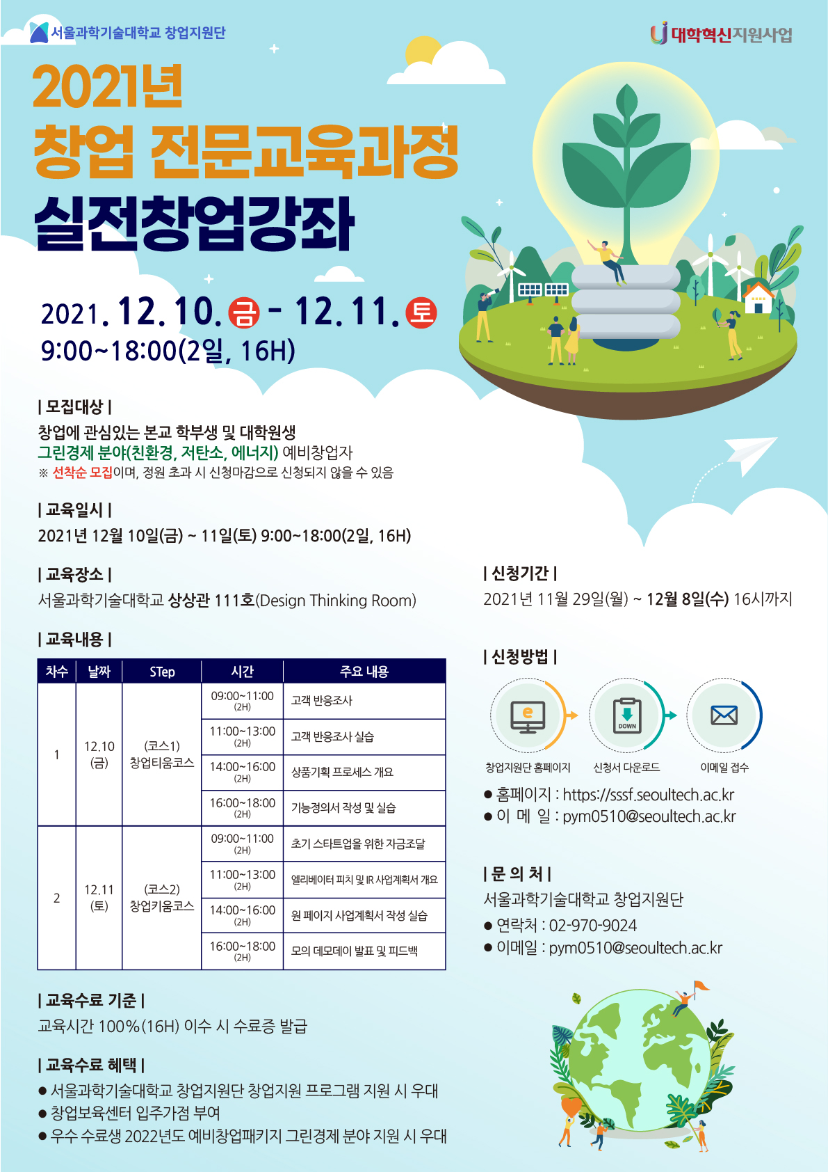 | 제목 | [창업지원단] 2021년 창업 전문교육과정 실전창업강좌 교육생 모집 | 날짜 | 2021-12-02 | 조회수 | 1087 |