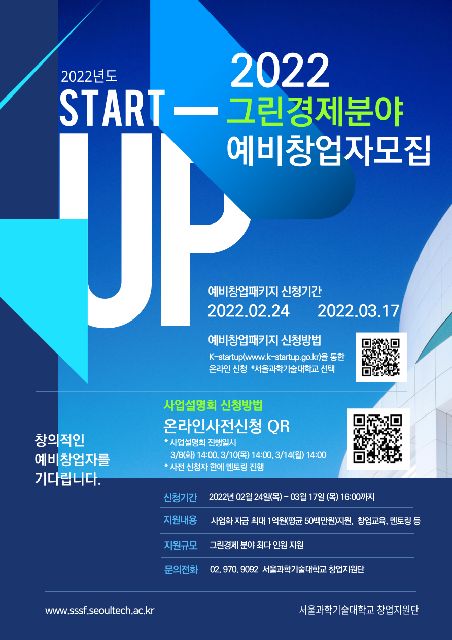 | 제목 | [창업지원단] 2022 그린경제분야 예비창업자 모집 안내 | 날짜 | 2022-02-28 | 조회수 | 2463 |