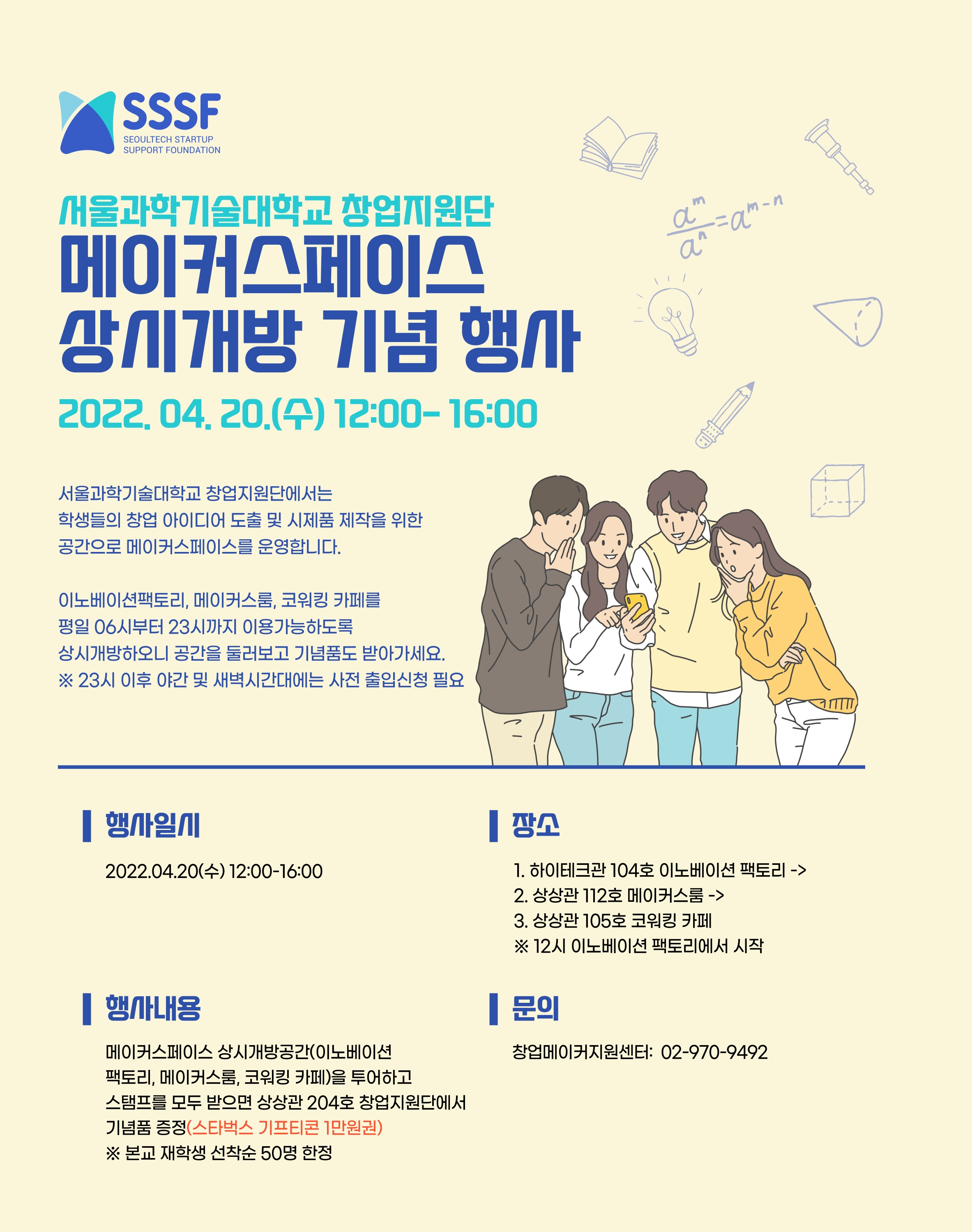 ■ 행사일시: 22.04.20(수) 12:00-16:00 ■ 행사내용: 메이커스페이스 상시개방공간을 투어하고 스탬프를 모두 받으면 상상관 204호 창업지원단에서 기념품 증정(스타벅스 기프티콘 1만원권) ■ 문의: 02-970-9492 |