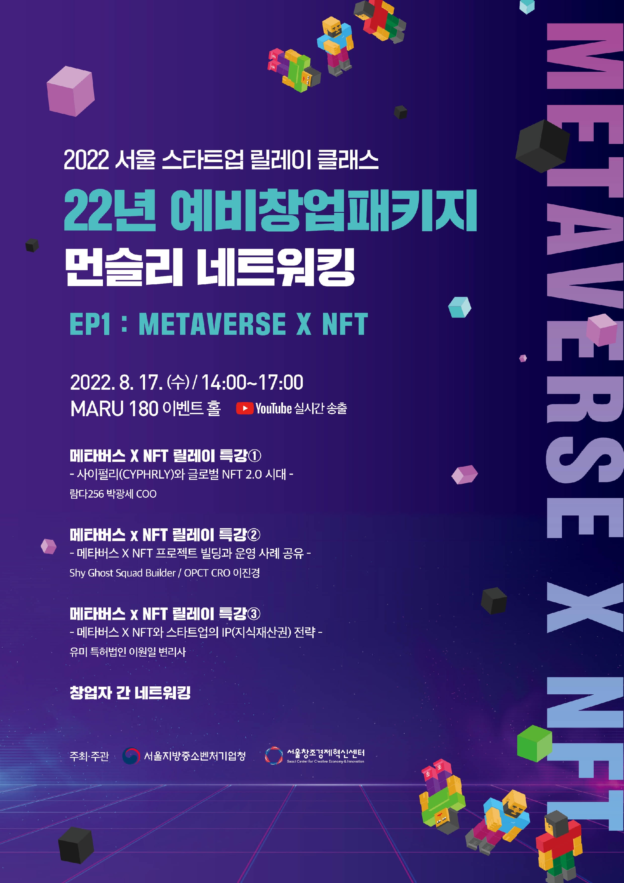 메타버스 X NFT 분야 연사들의 릴레이 특강 및 창업자 간 네트워킹이 진행되는 서울 스타트업 릴레이 클래스가 개최됩니다!
