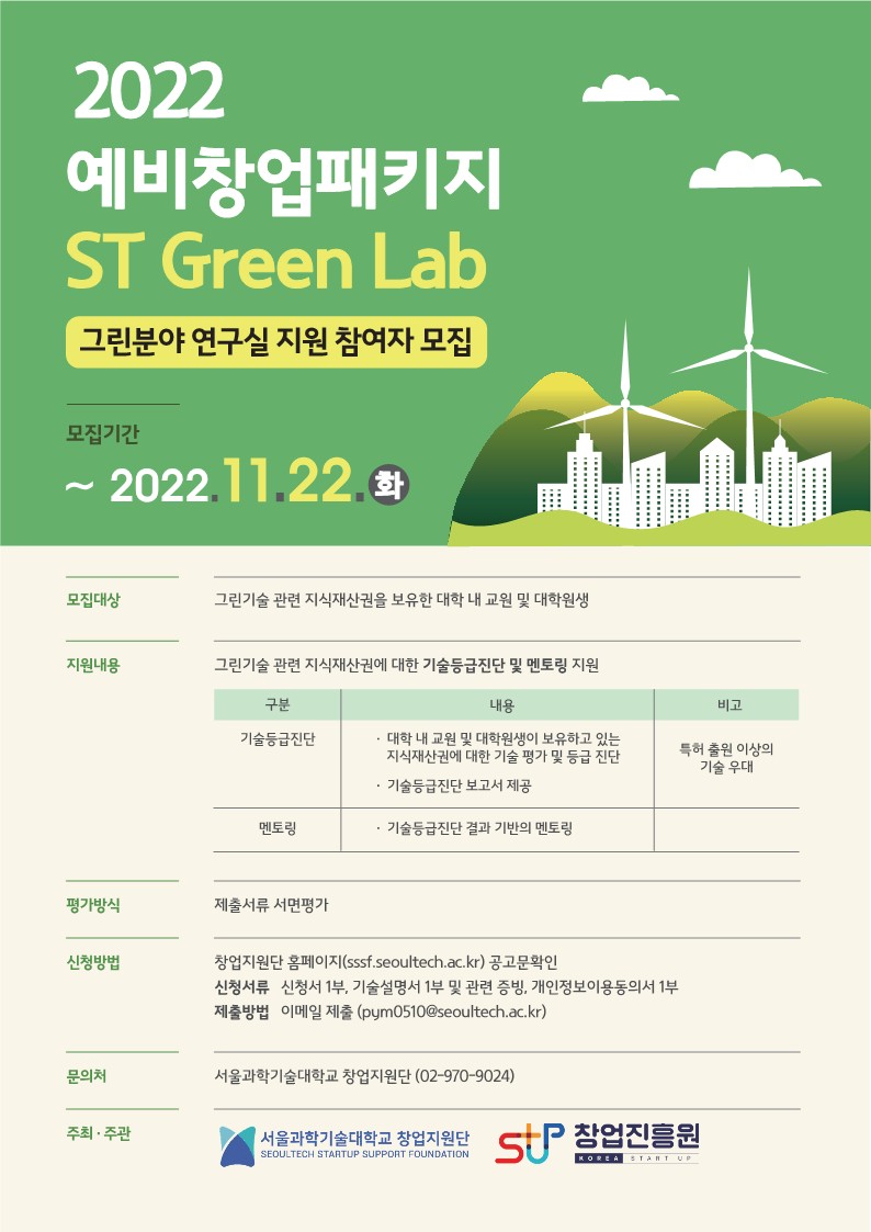 2022년 예비창업패키지 ST Green Lab(그린분야 연구실 지원) 기술등급진단 지원 프로그램