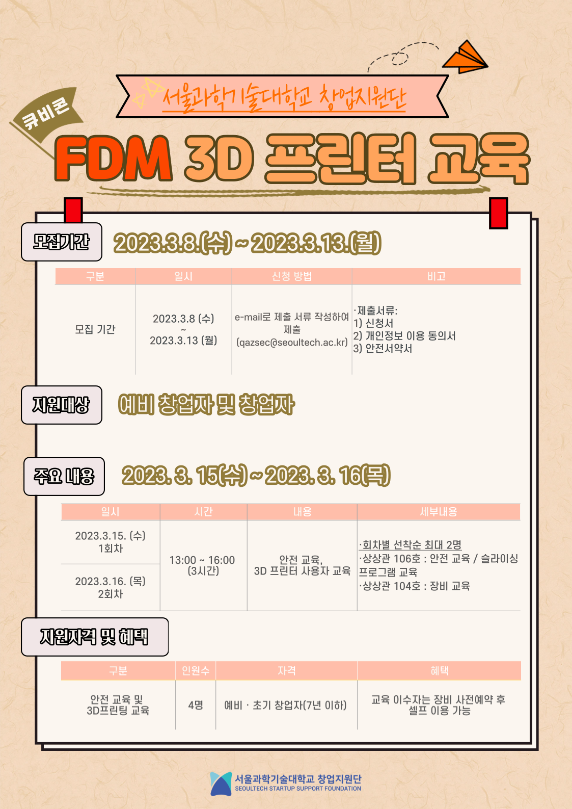 □ 창업메이커지원센터 3D프린터 사용자 심화 교육(2차) 모집 □ 운영기간: 2023.3.15.(수) ~ 3.16.(목) □ 신청기간: 2023.3.8.(수)09:00 ~ 2023.3.13.(월) 18:00까지 □ 신청방법: 이메일 접수 *e-mail: qazsec@seoultech.ac.kr □ 제출서류 -신청서(개인정보수입·이용·제공 동의서), 안전서약서, 예비창업 확약서 -신청서에 교육희망 회차 선택 표시 ※중복신청 불가 □ 신청대상: 예비창업자 및 창업자(창업기간 7년미만) □ 모집인원: 강좌별 선착순 2명 □ 교육일정 1강좌 : 2023.03.15.(수) 13:00~16:00 2강좌 : 2023.03.16.(목) 13:00~16:00 □ 교육내용: 안전교육, 3D프린터 사용자 교육 □ 문의처: 서울과학기술대학교 창업지원단 메이커지원센터(02-970-9497)