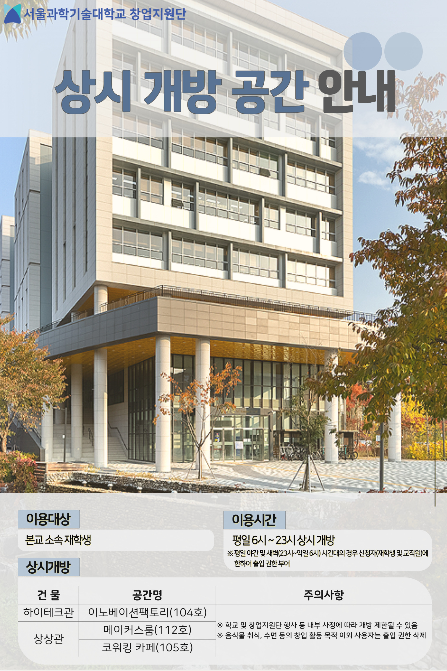 □ 이용시간 : 평일 6시 ~ 23시 상시 개방 ※ 평일 야간 및 새벽(23시 ~ 익일 6시) 시간대의 경우 신청자(재학생 및 교직원에 한함)에 한하여 출입 권한 부여 □ 문 의 : 서울과학기술대학교 창업지원단 메이커지원센터(02-970-9492, 상상관 102호)