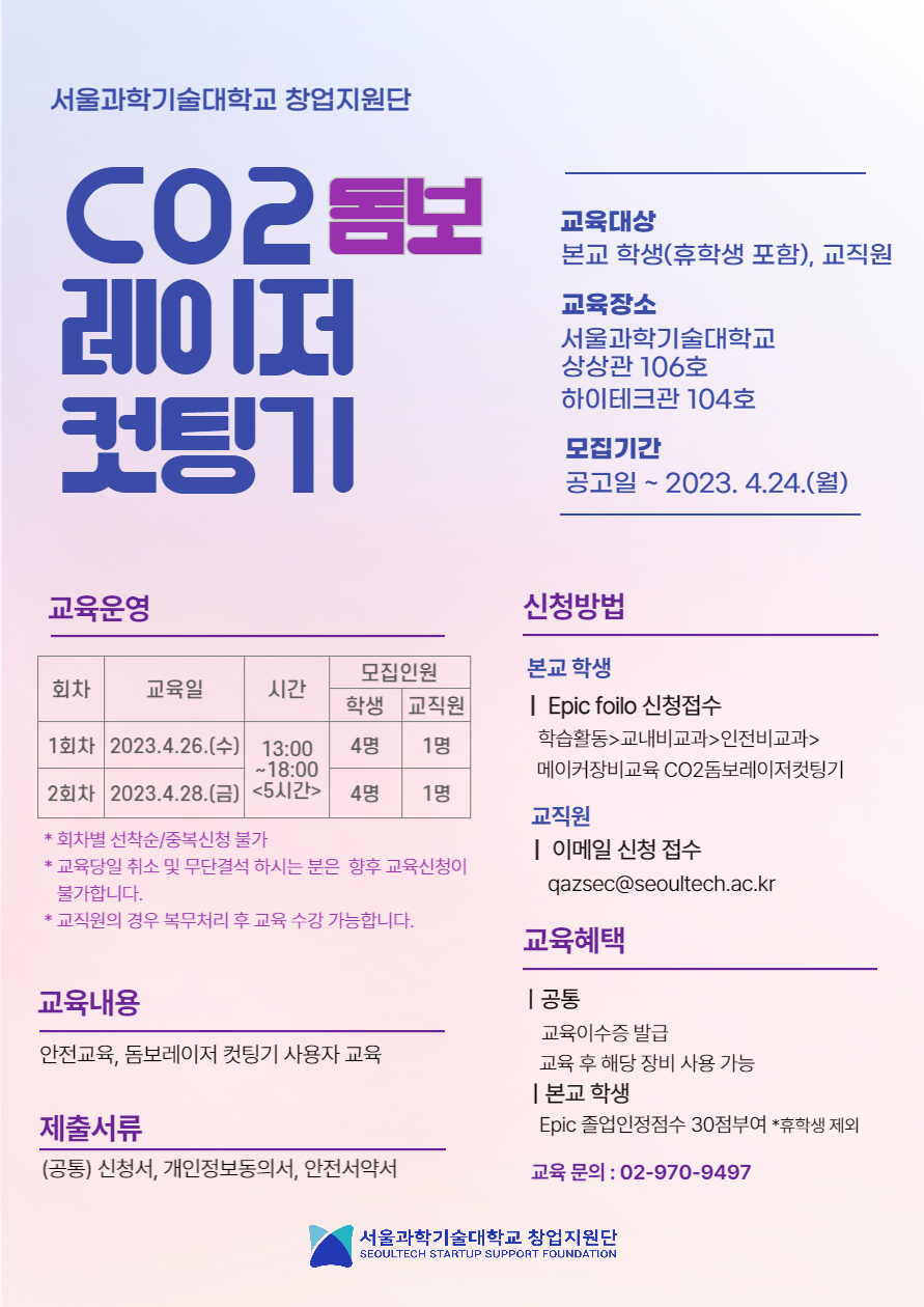 ※ 각 회차 대상자별 선착순/ 중복신청 불가 ※ 교육당일 취소 및 무단 결석 하시는 분은 향후 교육신청이 불가합니다. ※교직원의 경우 복무처리 후 교육 수강 가능합니다. 〇 교육내용: 안전교육, CO2돔보레이저커팅기 사용자 교육 〇 신청방법: ∘본교학생: Epic folio 신청 접수 학습활동>교내비교과>인정비교과>창업메이커지원센터 CO2돔보레이저커팅기 사용자 교육 ∘교직원: 이메일 접수 (e-mail) qazsec@seoultech.ac.kr 〇 제출서류(공동) -신청서(개인정보수입·이용·제공 동의서), 안전서약서 -신청서에 교육희망 회차 선택 표시 ※중복신청 불가 〇 교육혜택 (공통) - 교육 이수증 발급 - 교육 후 해당 장비 사용 가능 (본교학생) - Epic 졸업요건 인정비교과 점수 30점 부여(휴학생제외) - 교육 이수증 발급 〇 문의처: 창업지원단 메이커지원센터(02-970-9497) |