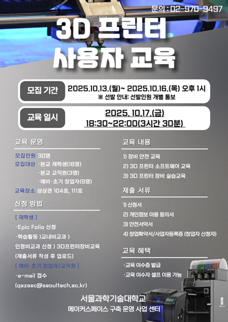| 제목 | [메이커장비교육] 3D프린터 장비교육 | 날짜 | 2025-10-13 | 조회수 | 392 |
