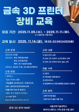 교육일시 : 2025.11.14.(금) 18:30~22:00(3시간 30분) 모집기간 : 2025.11.05.(수)~2025.11.11.(화) -선발인원 개별통보 모집인원 : 20명(본교학생 12명, 교직원 2명, 창업자 6명) 문의 : 유선 - 02-970-9497 이메일 - qazsec@seoultech.ac.k 교육 내용 : 장비안전 교육, 소프트웨어 교육, 실습 교육 |