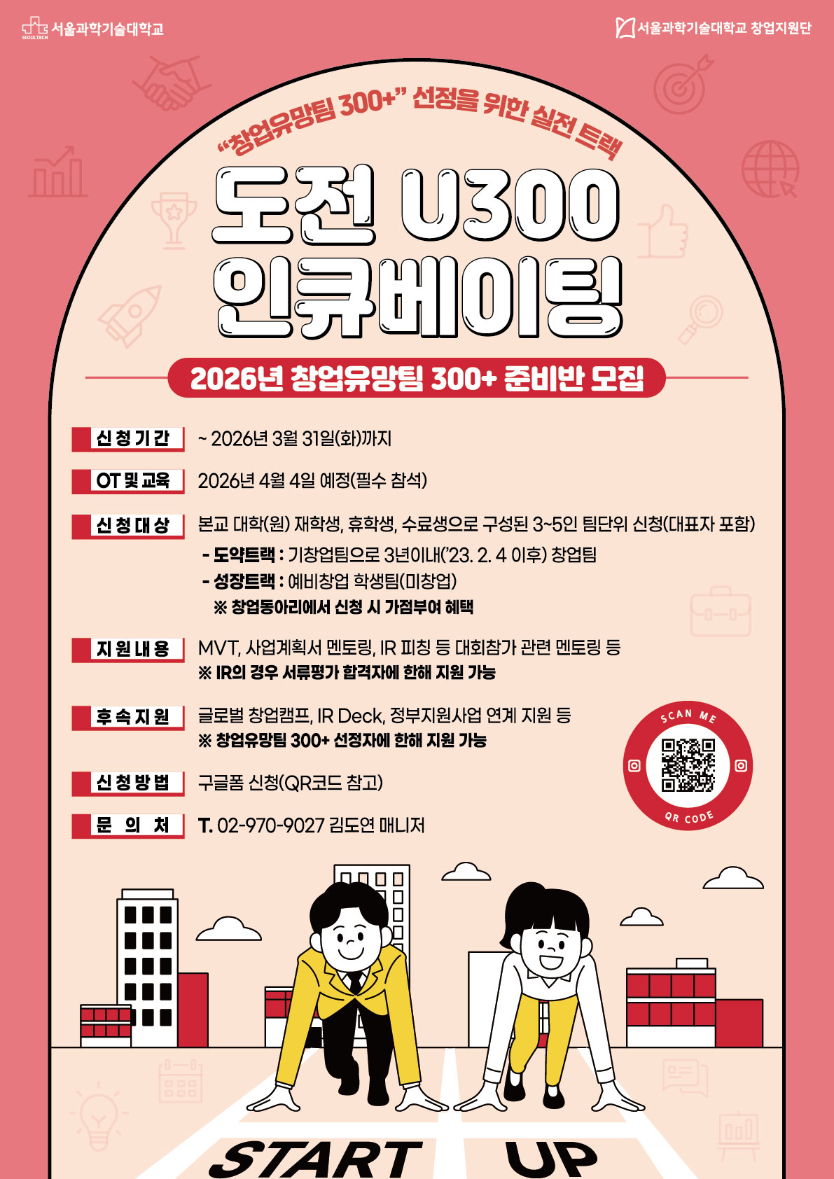 창업지원단에서는 2026년 창업유망팀 300+에 도전하는 학생창업팀을 대상으로 준비반을 모집하오니 많은 참여 바랍니다.