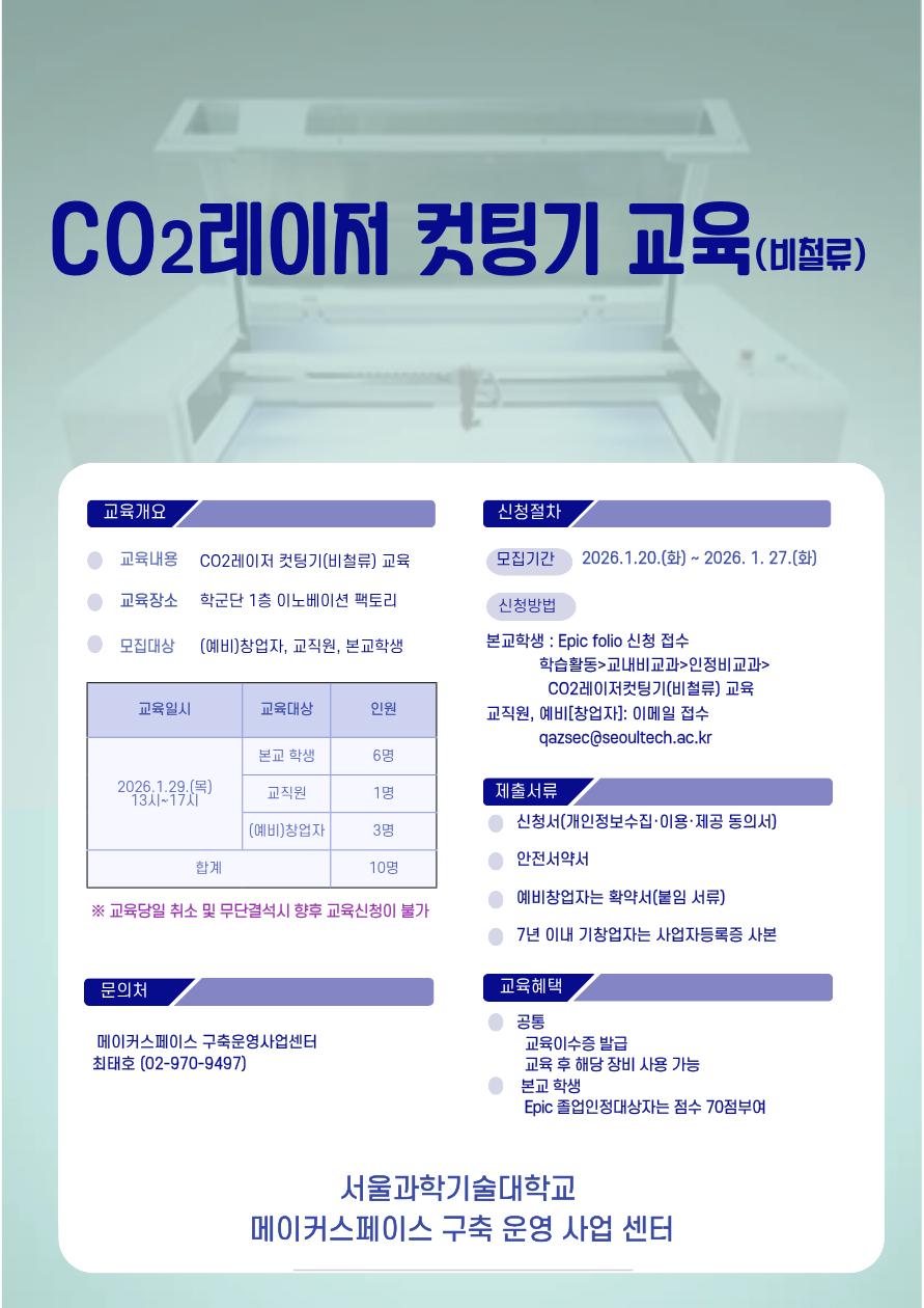CO2레이저커팅기 장비교육 모집기간 2026년 1월 20일~2026년 1월 27일 (화) 교육일 2026년 1월 29일 (목) 모집인원 본교학생 6명 교직원 1명 (예비)창업자 3명)