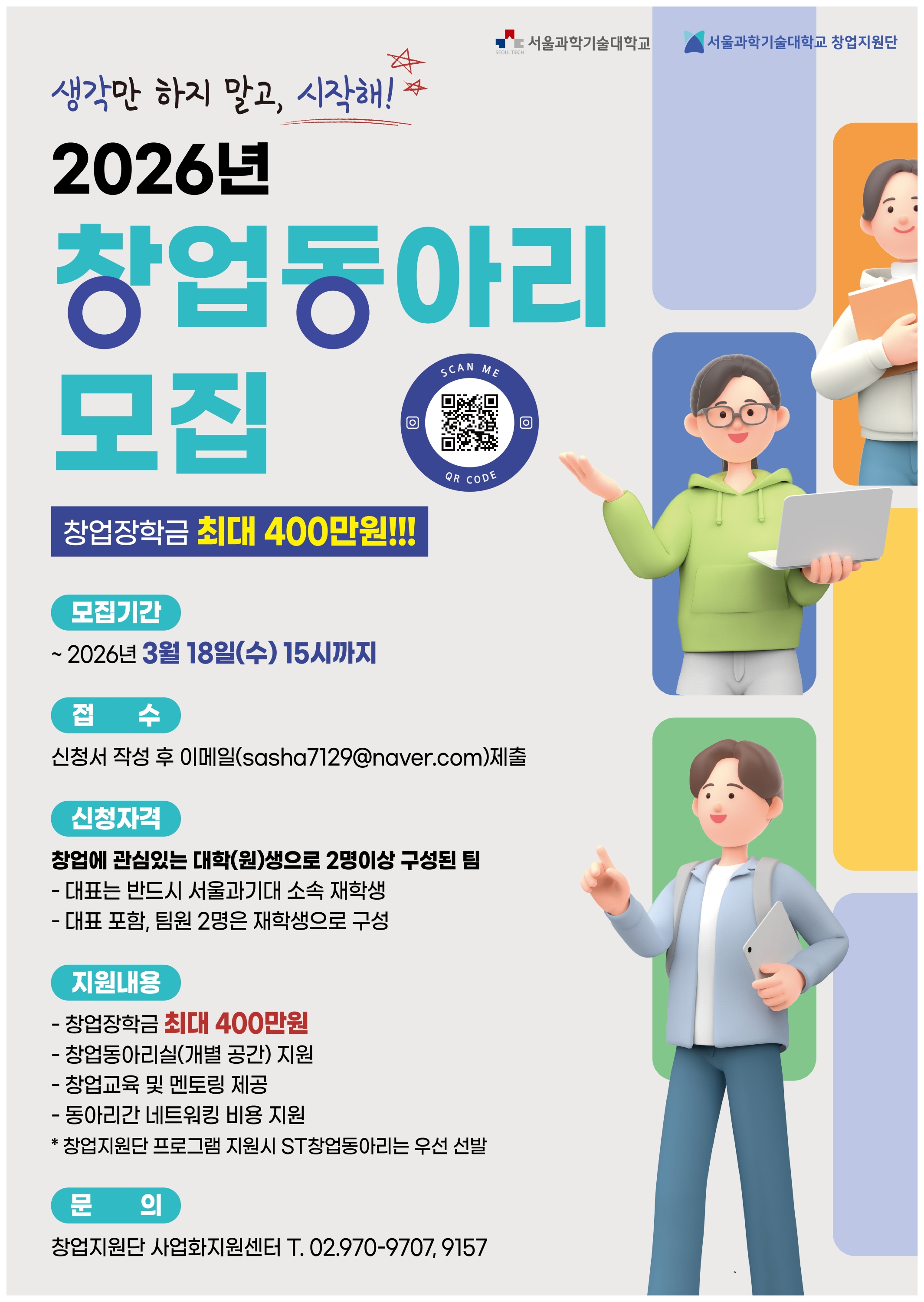 2026년 ST창업동아리를 모집합니다. ■ 신청자격: 창업에 관심있는 대학(원)생으로 2명이상 구성된 팀 - 대표는 반드시 서울과기대 소속 재학생 - 대표 포함, 팀원 2명은 재학생으로 구성 ■ 지원내용 - 창업동아리 사업화지원금(최대 400만원) 지원 *우수동아리 선정시 - 학생창업준비공간(창업동아리실) 개별 공간 지원 *우수동아리 선정시 - 창업교육 및 1:1 전문가 멘토링 제공 - 동아리간 네트워킹 비용 지원 - 창업지원단 프로그램 지원시 ST창업동아리는 우선 선발